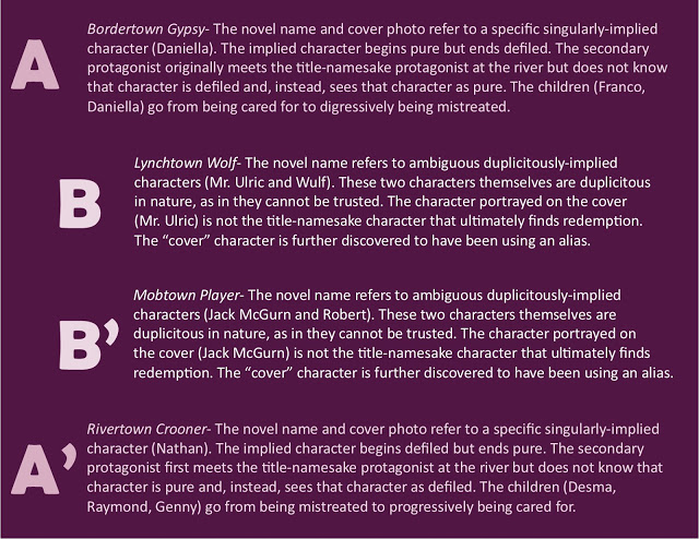 - Both Bordertown Gypsy and Mobtown Player end on a cliffhanger. There is a shooting at the end of each book. The character to last touch the bullet becomes the character who is redeemed next (and in the novel which follows). In contrast, both Lynchtown Wolf and Rivertown Crooner have a more-or-less resolved ending with the anticipation of future events.